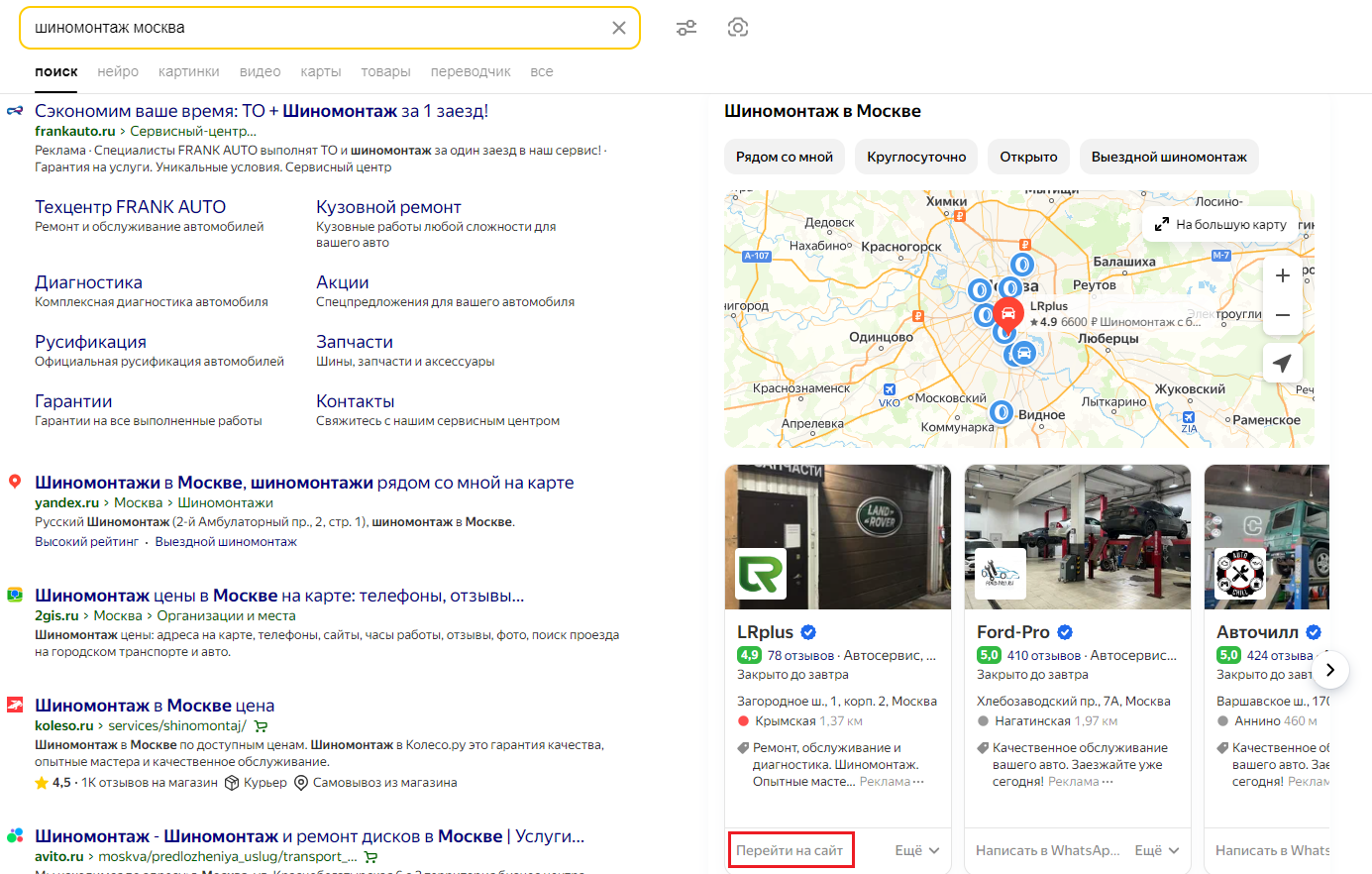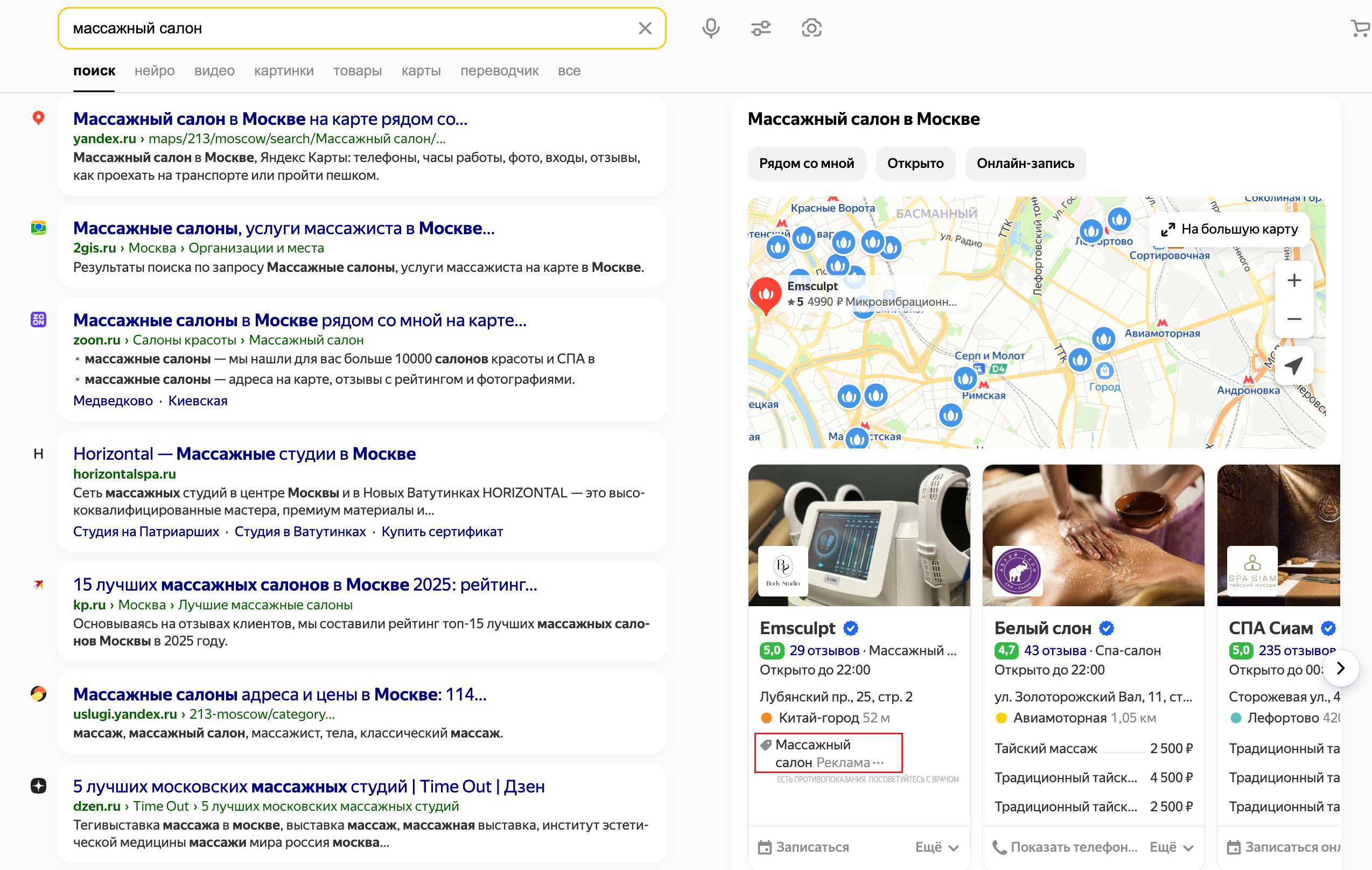 Когда пользователь ищет информацию об интересующих его местах на поиске Яндекса, под поисковой строкой или справа от выдачи ему показываются профили компаний из его региона, которые подходят под его запрос. Карточка вашей организации сможет показываться на специальных позициях среди аналогичных компаний. Так пользователи, которые уже ищут, куда сходить или где получить услуги, похожие на ваши, с большей вероятностью выберут вас и перейдут в карточку организации, решат позвонить вам или сразу доехать.