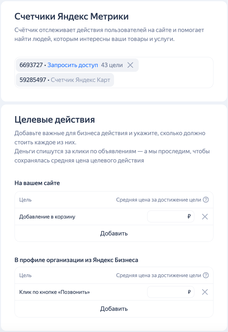 Выберите цель продвижения и целевые действия. Для более эффективного продвижения добавьте цели с сайта и цели счетчика для профиля организации. Этот счетчик создается автоматически для карточки организации и фиксирует такие действия пользователя в карточке, как клик по кнопке «Позвонить», клик по кнопке «Построить маршрут», переход в мессенджер и другие.
