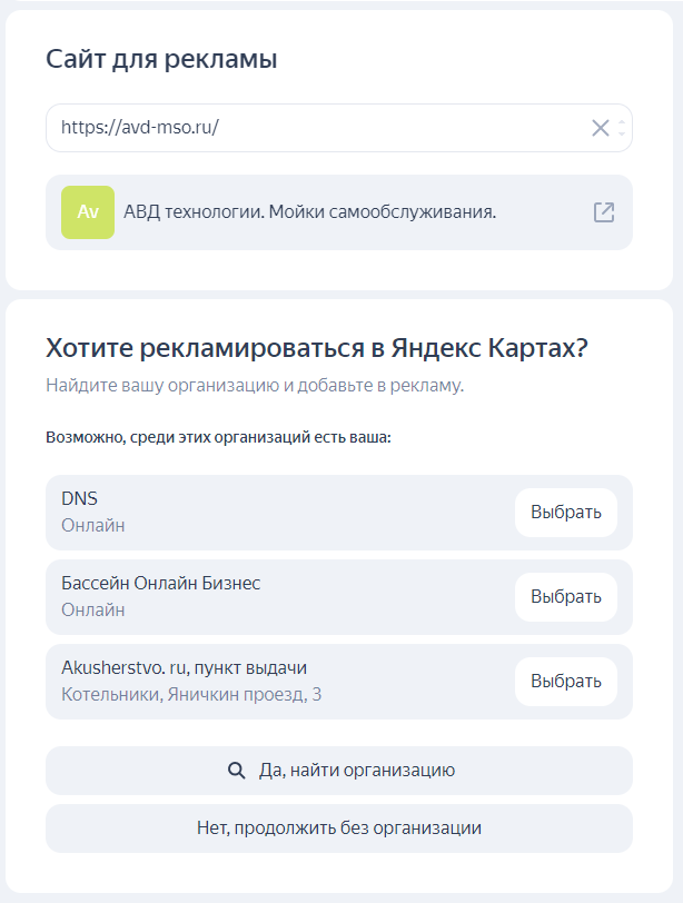 Если вы создаете кампанию без сайта, аналогично добавьте организацию вручную.