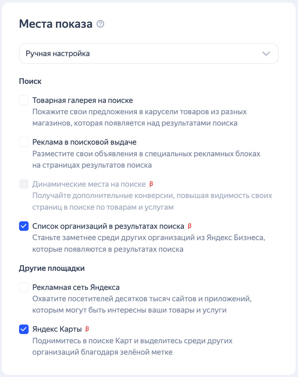 В блоке Места показа оставьте по умолчанию Поиск, Рекламная сеть и Карты или выберите Ручная настройка → Яндекс Карты и/или Список организаций в результатах поиска.