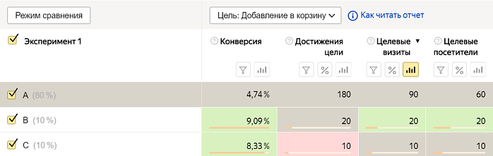 Чтобы просмотреть статистику эксперимента в Метрике, постройте стандартный отчет «Директ, эксперименты». Выберите эксперимент, который хотите проанализировать. Выберите сегмент с кампаниями Директа, которые созданы для эксперимента. Нажмите кнопку Режим сравнения и выберите контрольную группу. Вы увидите отчет о соответствующем эксперименте. Добавьте Цели, которые интересуют вас в рамках эксперимента, например добавление товара в корзину.