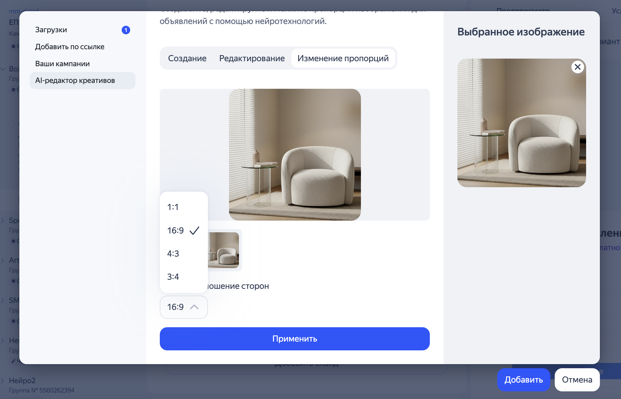 Чтобы креатив привлекательно выглядел на разных местах показа, можно изменить его пропорции с помощью AI-редактора креативов. Доступные соотношения сторон — 16:9, 4:3, 1:1 и 3:4.