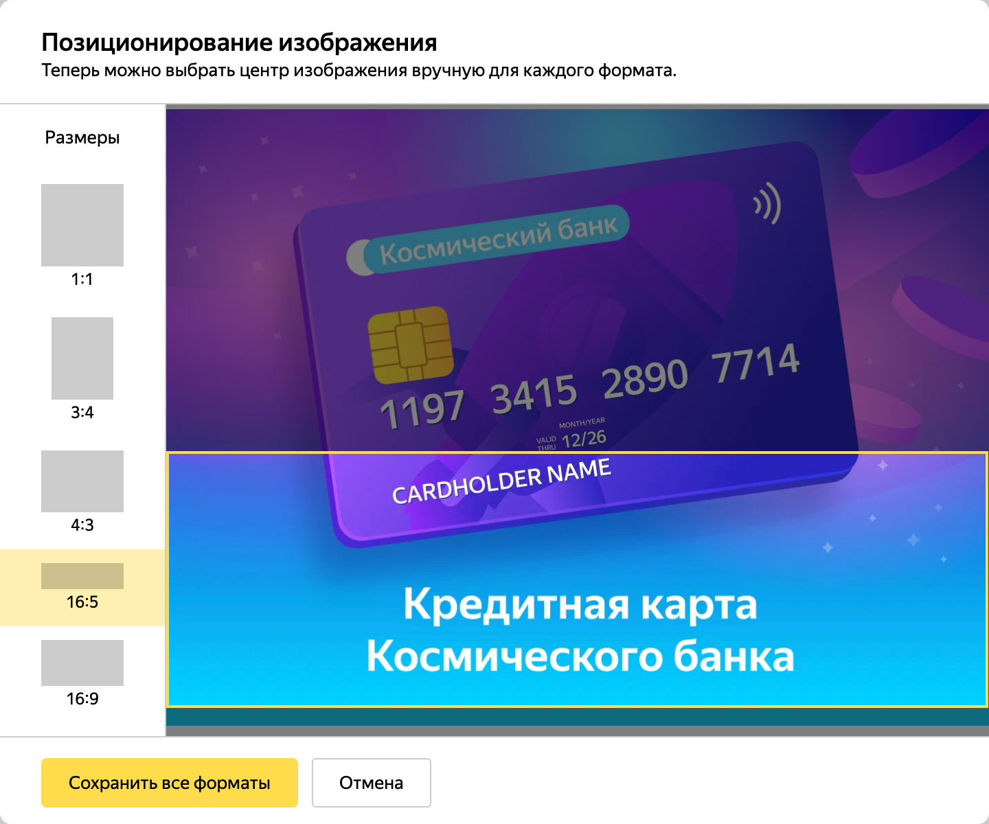 При размещении в рекламном блоке на той или иной площадке изображение может быть уменьшено и обрезано. Если в каком-то из форматов ваше изображение обрезано не так, как вам хотелось бы, задайте смарт-центры вручную.