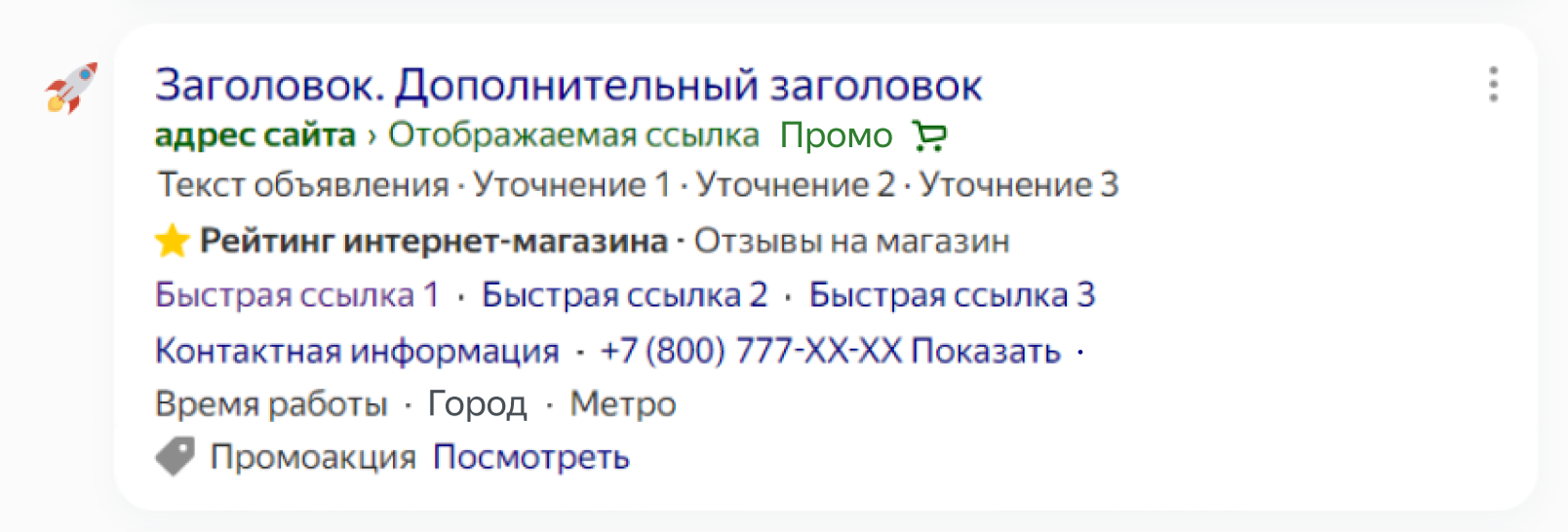Чтобы сделать объявления более эффективными, мы рекомендуем при создании или редактирования объявления заполнять все доступные поля. Так система сможет составить больше вариантов, актуальных для разных пользователей и ситуаций. Например, добавить изображение, текст и быстрые ссылки одновременно для людей, которые любят изучать объявления, прежде чем перейти по ним.
