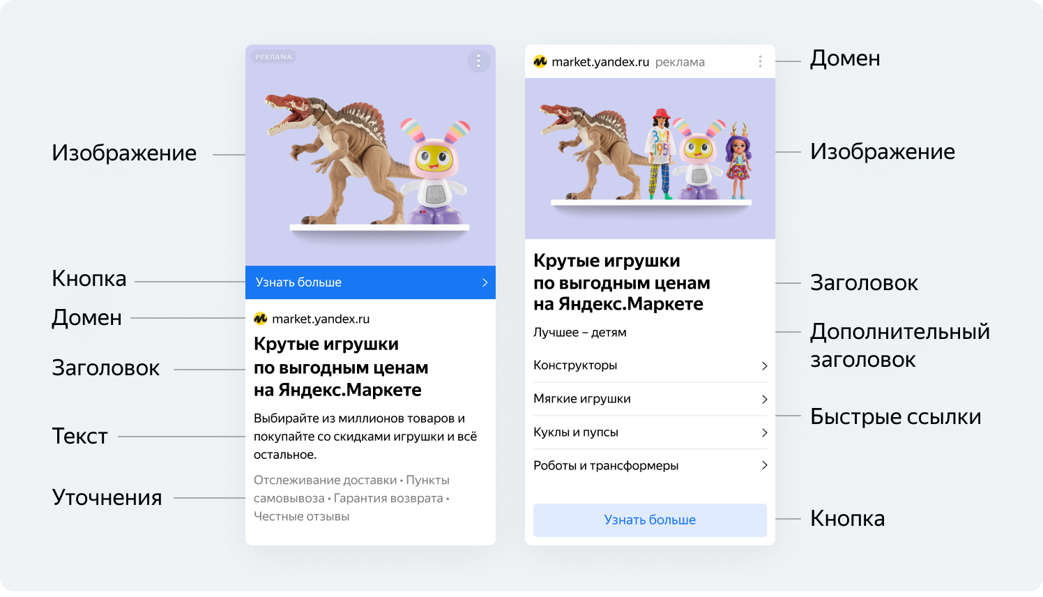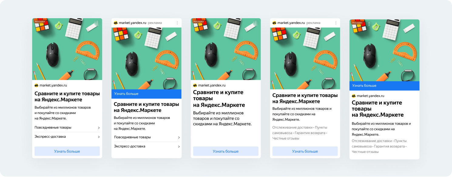 Smart Design подбирает для показа только те элементы объявления, которые будут актуальны для конкретного пользователя на конкретном сайте в момент показа.