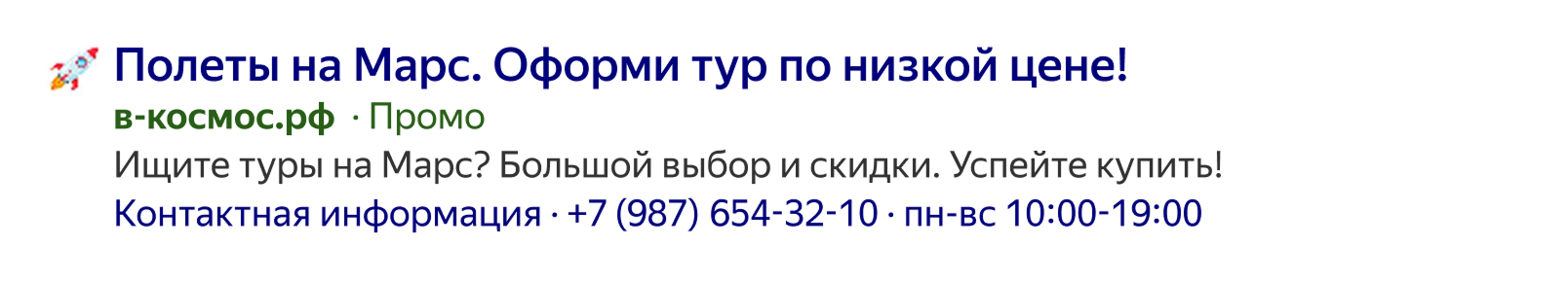 Расскажите пользователю, почему стоит выбрать именно ваше предложение. Укажите конкурентные преимущества: скидки, акции, условия доставки, гарантию и т. д. Стоимость товара или услуги обозначит ценовой сегмент и исключит нецелевые клики. Название фирмы привлечет внимание, если бренд известный и узнаваемый. Важно, чтобы информация в объявлении была достоверной и подтверждалась на сайте. Если пользователь не сможет сразу найти то, о чем шла речь в объявлении, он уйдет с сайта.