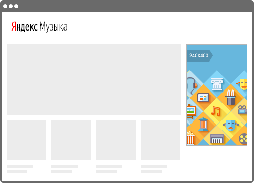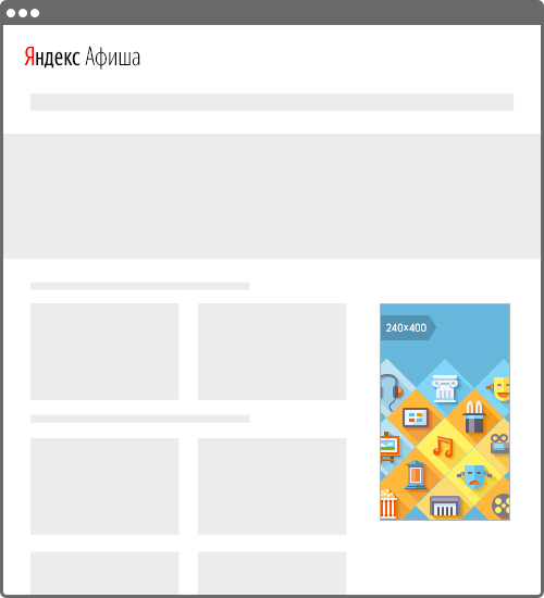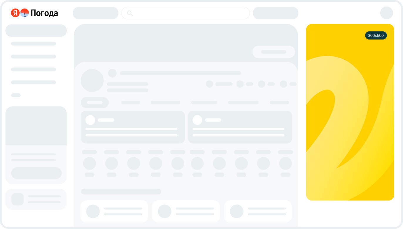 Баннер на сервисах Яндекса — это медийный формат, который показывается на страницах Погоды, Почты, Игр, Картинок, Видео, Телепрограммы, Авто.ру, Переводчика, Кинопоиска, Музыки, Афиши и телевизорах на YaOS . Баннер позволит привлечь внимание качественной аудитории в момент, когда она изучает контент, отдыхает или планирует досуг. Благодаря заметным позициям и широкому охвату продукта помогает строить знание о бренде в момент взаимодействия с популярными сервисами Яндекса.