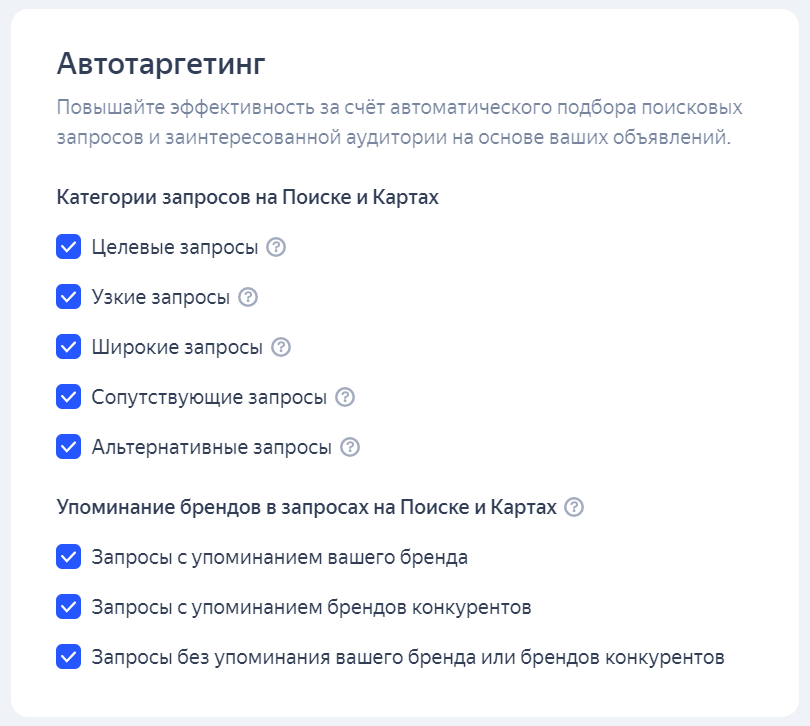Для работы автотаргетинга на поиске выберите категории запросов, в которых он будет включен.