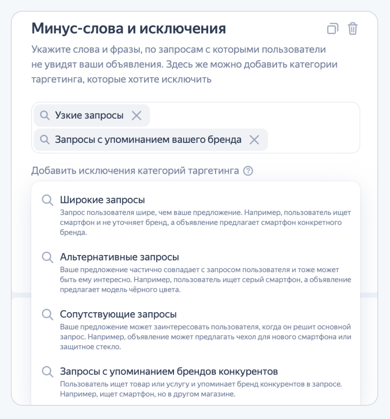 В блоке Упоминание бренда в запросах на Поиске или в Картах выберите, какие запросы будут отбираться для показа объявлений — с упоминанием вашего бренда, бренда конкурентов или вообще без брендов. Например, вы можете использовать автотаргетинг в отдельных кампаниях для брендовых запросов.