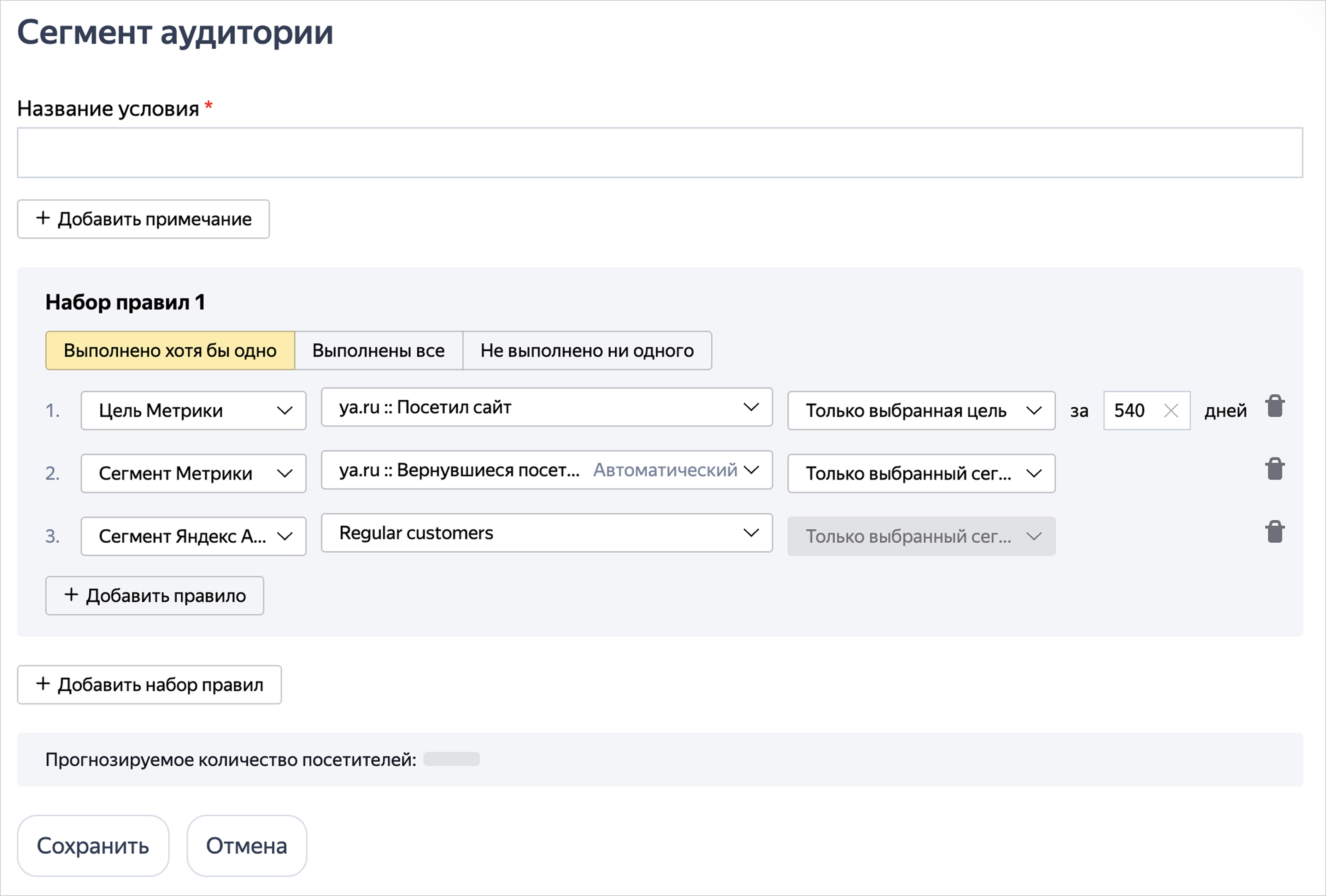 Условие формирования сегмента аудитории может состоять из одного или нескольких наборов правил (не более 50), объединенных оператором «И».