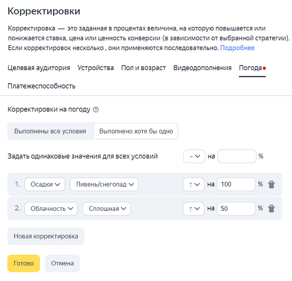 Вы можете настроить корректировки ставок, цены или ценности конверсии в зависимости от погодных условий: температуры воздуха, интенсивности осадков и облачности.