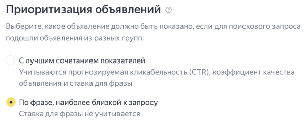 На уровне кампании, если по фразам подошло несколько объявлений разных групп, по умолчанию выбор для показа происходит по показателям эффективности — кликабельности (CTR), коэффициенту качества и ставке за клик. Вы можете изменить настройку и выбирать объявление с самой релевантной запросу фразой. Для этого в дополнительных настройках кампании в блоке Приоритизация объявлений выберите По фразе, наиболее близкой к запросу.