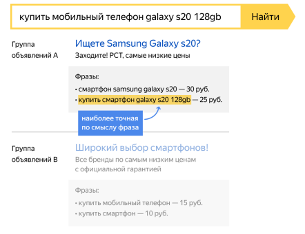 Для запроса купить мобильный телефон galaxy s20 128gb фраза купить смартфон Samsung galaxy s20 128 gb из группы А более точно совпадает с запросом — не по словам, а по смыслу, поэтому показ будет по ней. При этом пользователь увидит более релевантное объявление в ответ на свой запрос, что увеличит вероятность клика по такому объявлению.