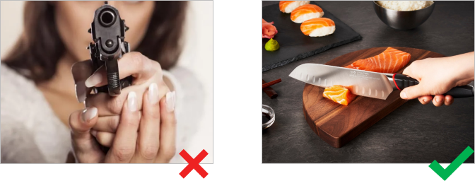 Товары или услуги, продвижение которых запрещено или ограничено законодательством (оружие, алкогольная продукция, наркотические и психотропные вещества, табачные изделия, азартные игры и другое). Исключение: Допускается изображение изделий, конструктивно сходных с оружием. Например, рисованное оружие в продвижении игр. Такие изображения не должны содержать жестоких сцен, включая прицеливания в пользователя.