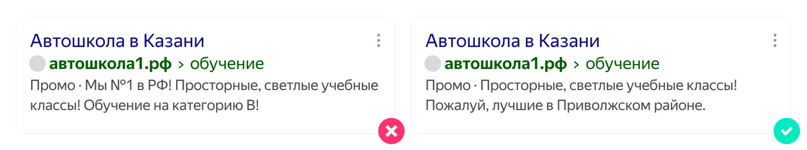 Слова в сравнительной или превосходной степени можно использовать в тексте объявления и уточнениях, если у вас есть независимое заключение о преимуществе вашего товара (услуги) перед другими товарами. Заключение должно быть размещено на странице перехода, или информация о нем должна быть указана в объявлении. Если у вас нет таких заключений, то использовать слова в превосходной степени не следует.