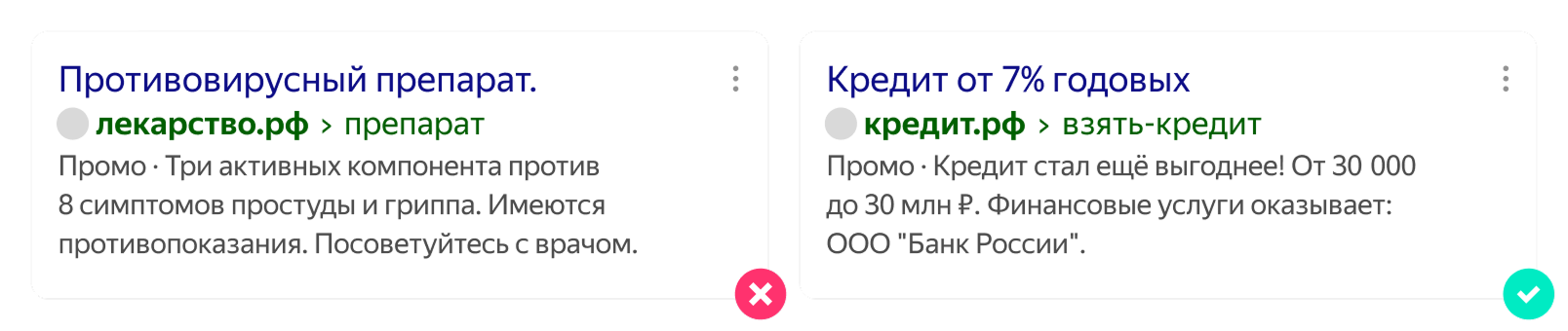 При продвижении медицинской деятельности, медицинских изделий, лекарственных средств, заменителей женского молока и питания для младенцев, БАДов, конструктивно сходных с оружием изделий, финансовых услуг, долевого строительства и новостроек, сертификации, букмекерской деятельности, дистанционной торговли в объявления необходимо добавлять предупреждение. Например: