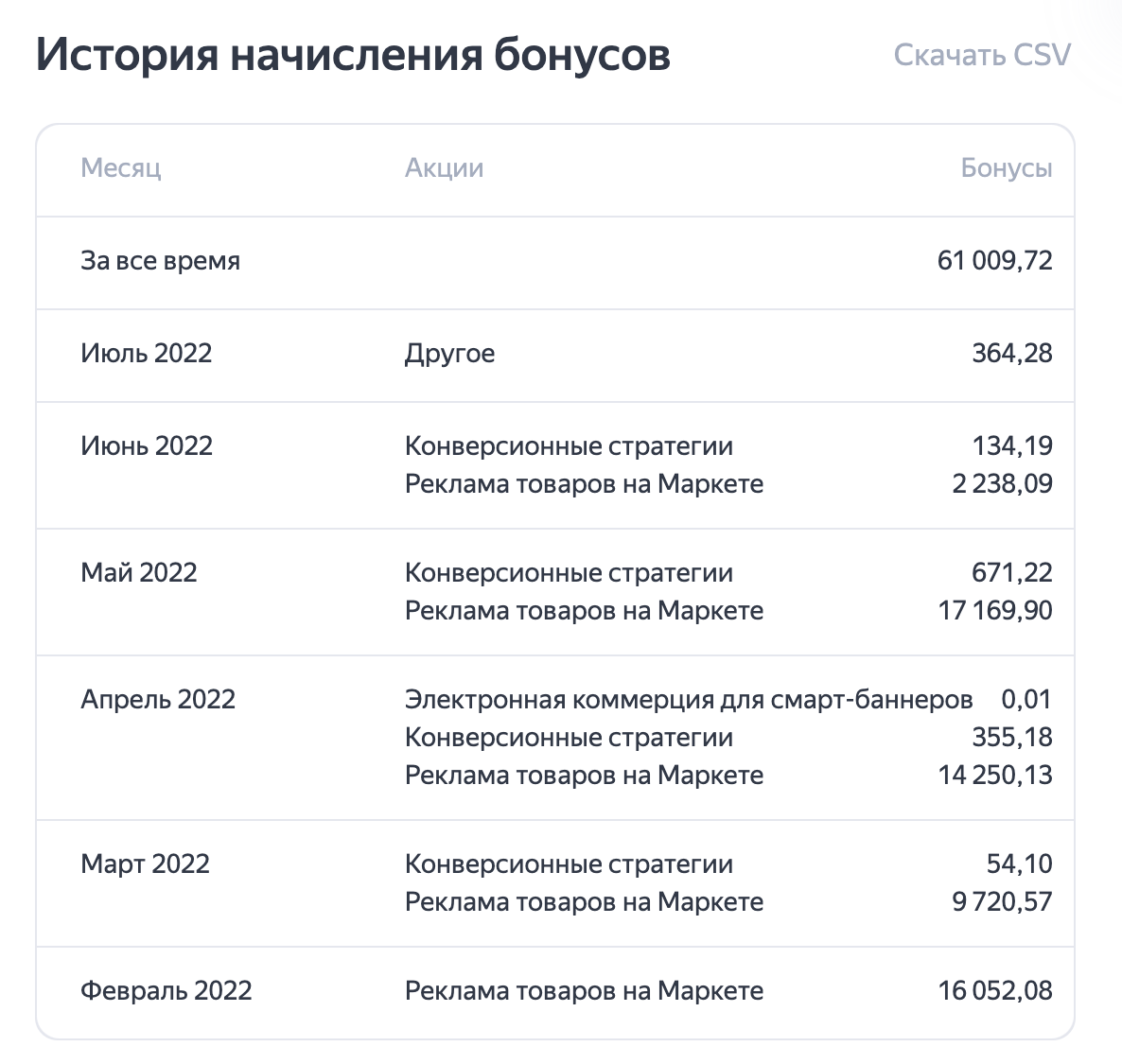 Сумма бонусов, заработанных за предыдущий период с учетом всех акций. Данные обновляются ежемесячно до 10 числа. Чтобы активировать бонусы и начать использовать их для оплаты кампаний, пополните счет до указанного срока.