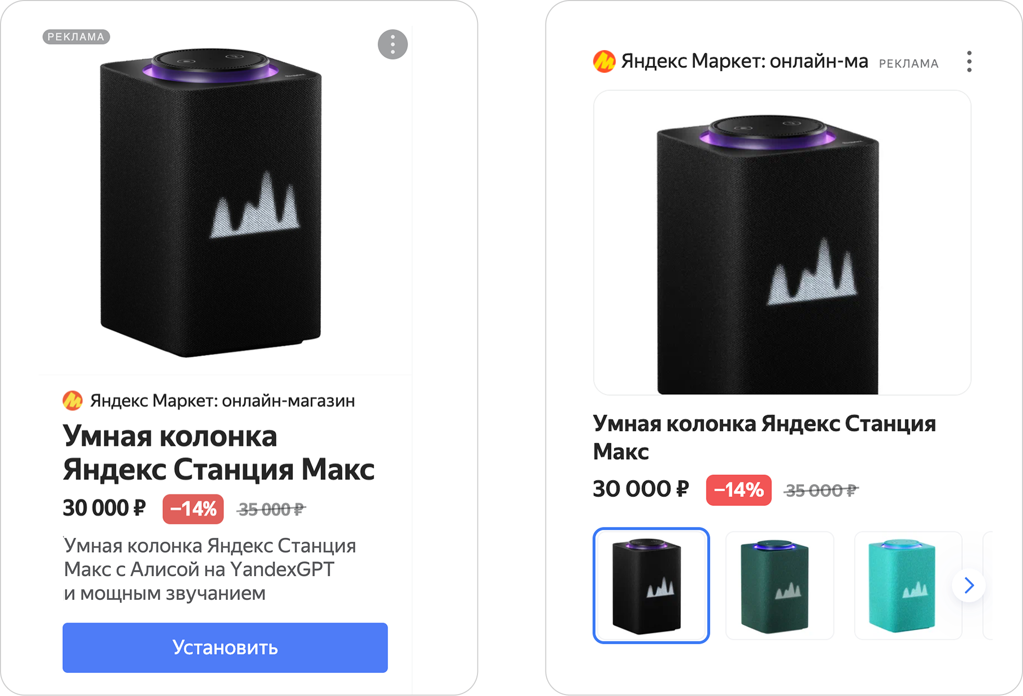 Товарное объявление — это тип объявления, которое создается из фида. Фид содержит информацию о товарах (например, название, изображение, цена) и трекинговую ссылку. Если добавить к трекинговой ссылке отложенный диплинк, пользователь после установки приложения сразу попадет на карточку товара. Можно запустить только в Единой перфоманс-кампании.