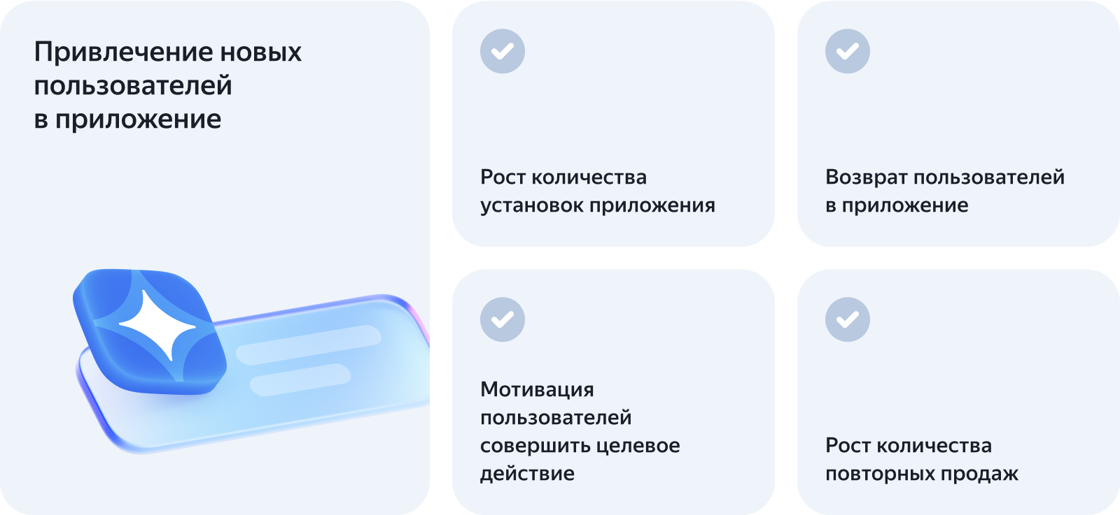 Продвижение приложений — инструмент Директа, который позволяет продвигать приложения на iOS и Android. С его помощью разработчики и паблишеры могут привлечь новых пользователей или вернуть тех, кто давно не заходил в приложение.