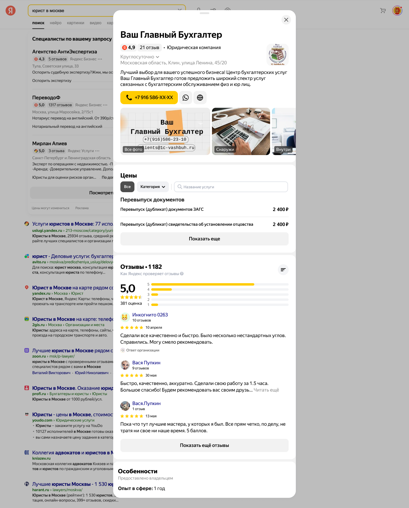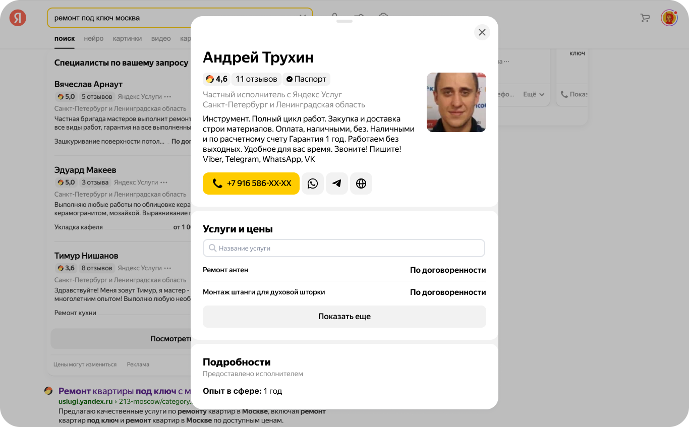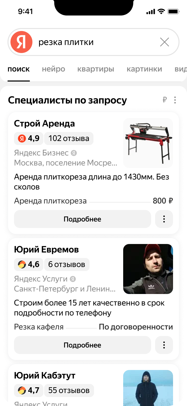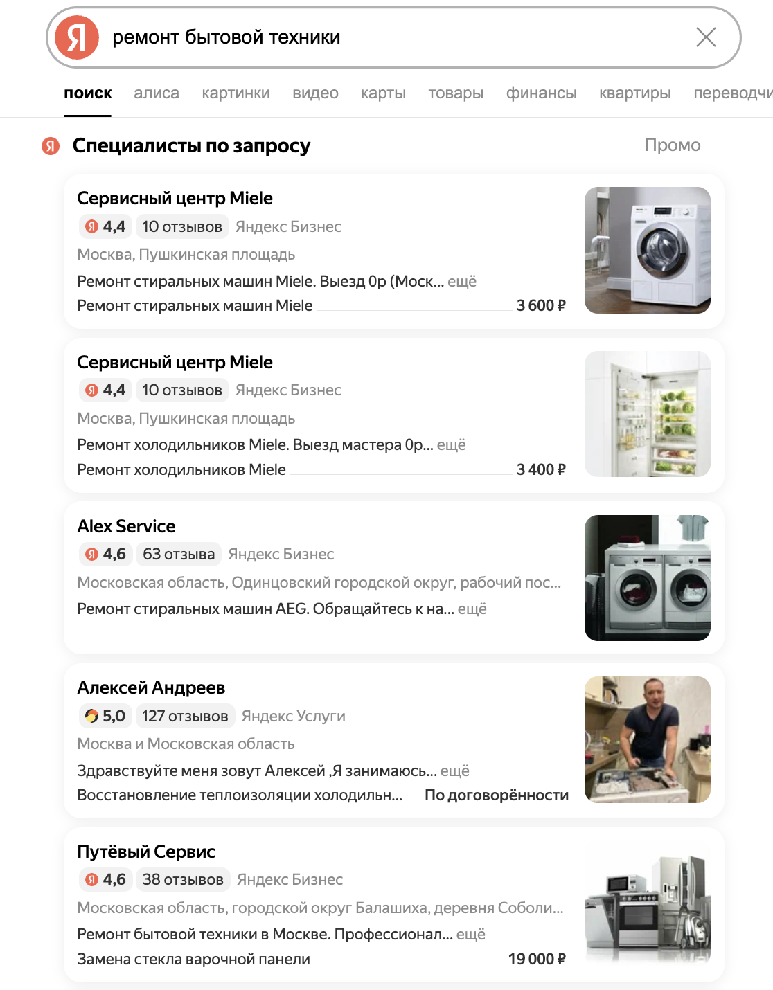 Галерея услуг — экспериментальный формат в виде объявлений организаций и частных мастеров с предложениями услуг над результатами поисковой выдачи.