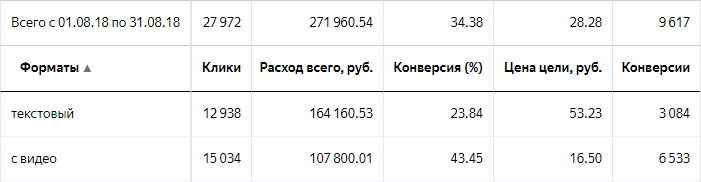 В этом примере цена конверсии для объявлений с видео — 16,5 руб. Если вас устраивает цена конверсии 50 руб., вы можете увеличить ставку для видео в 50 / 16,5 ≈ 3 раза, то есть на 200%.