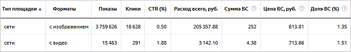 Например, для вашей кампании в сетях идут показы объявлений в разных форматах. Сравните статистику по форматам. Данные по Цене ВС и Доле ВС (%) позволяют сделать вывод, что видео эффективно работают для привлечения целевой аудитории. Настройте повышающие корректировки ставок для объявлений с видео, чтобы увеличить вероятность их показов.