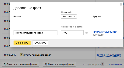 В открывшемся окне Добавление фраз отредактируйте фразу, если нужно, с помощью операторов, назначьте ставки на выбранные фразы или выставите единую цену, нажмите кнопку Сохранить.