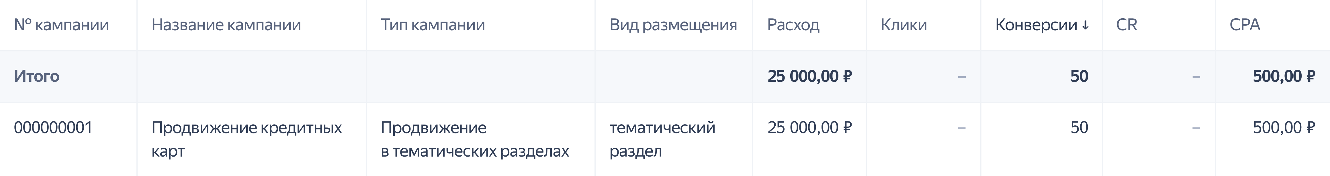 В Мастере отчетов для анализа используйте срез «Тип кампании» → «Продвижение в тематических разделах» или «Вид размещения» → «Тематический раздел». В отчете отображаются все ключевые метрики, в том числе данные о показах и конверсиях. В столбце «Конверсии» отображается число переходов на страницу оформления заявки.