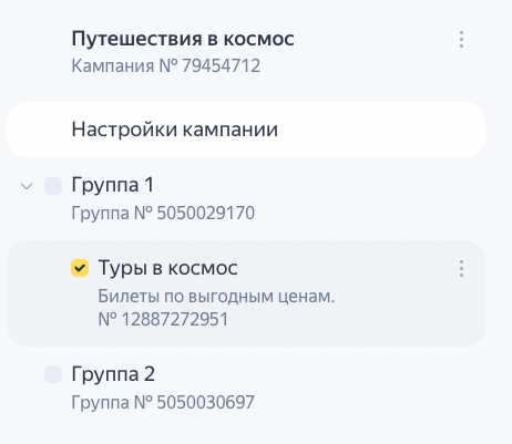 Через навигационное меню кампании (только для текстово-графических объявлений в Единой перфоманс-кампании):