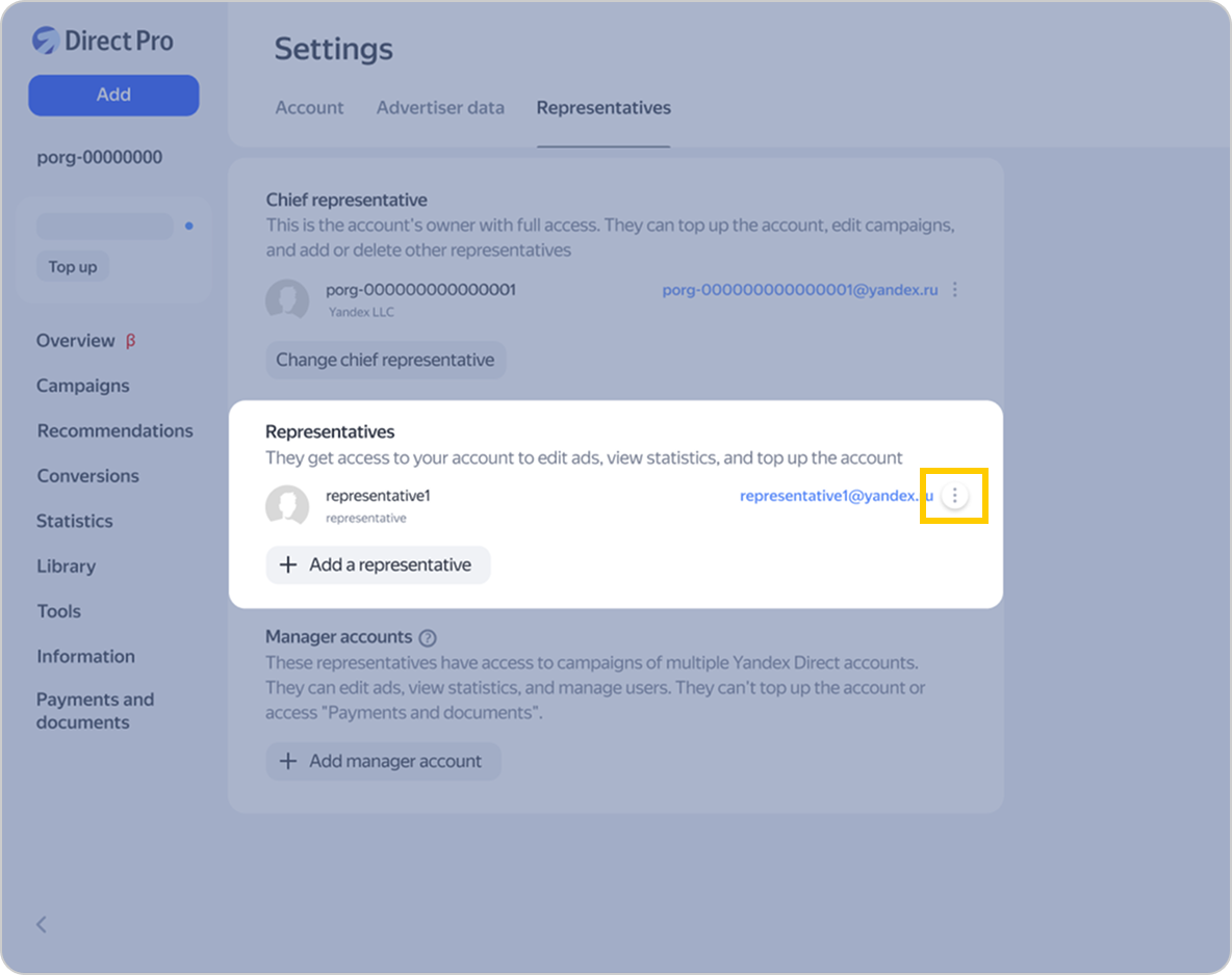 Yandex Direct’te pasaport kuruluşu modunda oturum açıldığında, kuruluştaki rolleri ne olursa olsun kuruluşun tüm çalışanlarının müşteri ana temsilcisi erişimi olur. Müşteri ana temsilcisi sadece kampanyaları yönetmek ve istatistikleri görüntülemekle kalmaz, aynı zamanda diğer müşteri temsilcilerinin erişim seviyesini de düzenleyebilir. Müşteri temsilcilerini yönetme hakkında daha fazla bilgi edinin.
