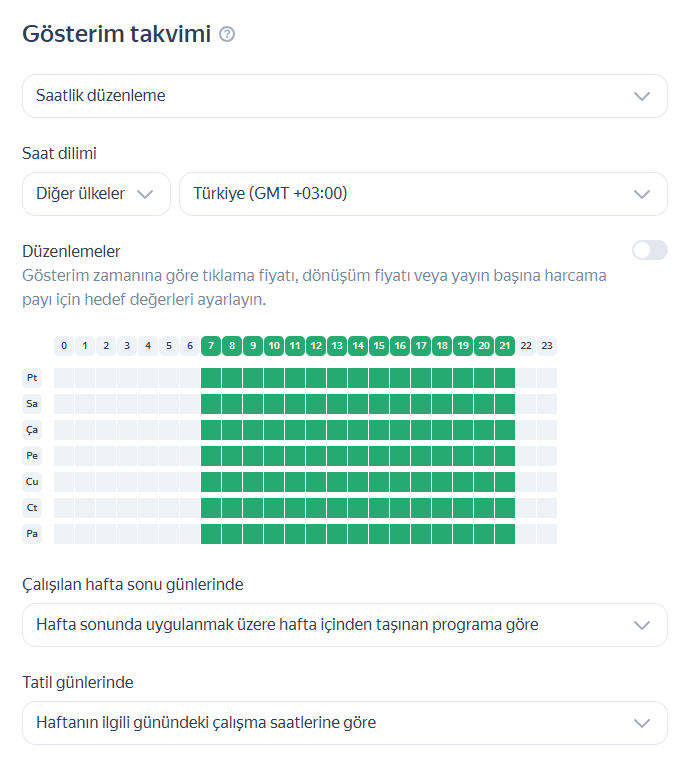 Kampanya ayarları sayfasındaki Gösterim Programı blokunda, reklamları ne zaman göstermek istediğinizi belirtin. Bunu şu şekilde yapabilirsiniz: