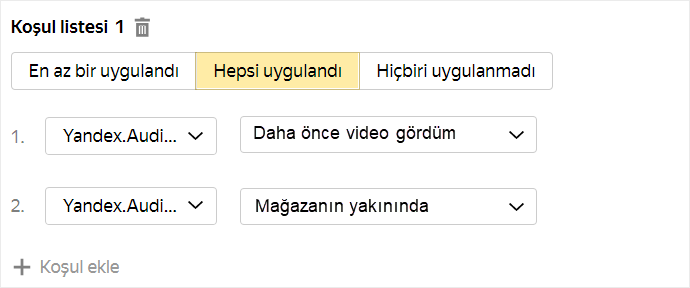 Örneğin videoyu sonuna kadar izlemeyen kullanıcıları elemek istiyorsunuz. “Gösterim” ve “%100 izleme” eylemlerini seçin. Yandex Audience’da iki segment oluşturulacaktır. Yeniden hedefleme ve kitle seçimi koşullarını ayarlarken, görüntülemeye başlayanların segmentini hedefleyin ve negatif koşul ile videoyu izlemiş olanları hariç tutun.