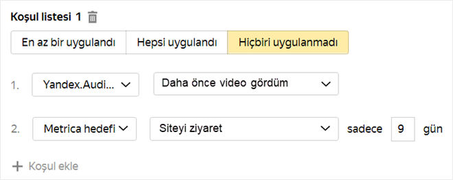 Örneğin videonuzu izlemiş ve web sitenizi ziyaret etmiş olanlar için negatif bir koşul yapılandırabilirsiniz. Medya kampanyası yapılandırıyorsanız ve medya reklamlarınız TV’de gösteriliyorsa kullanıcı profillerinde televizyon izlemeyen veya az izleyenlere reklam gösterimini ayrıca hedefleyebilirsiniz.