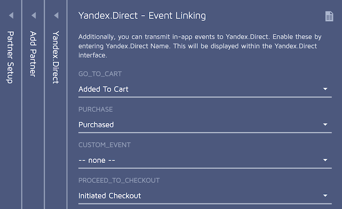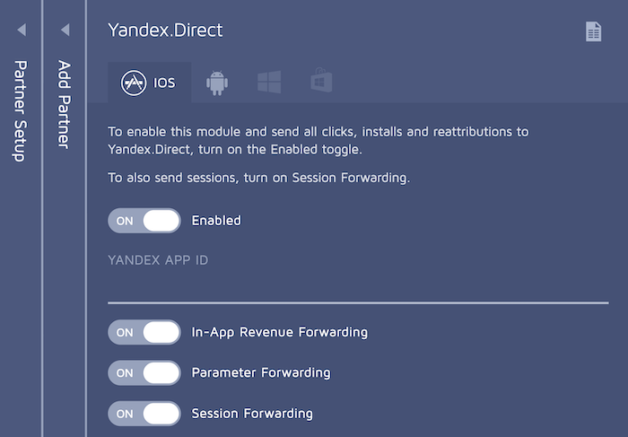 Yandex Direct, şu izleme sistemlerini destekler: AppMetrica, AppsFlyer, Adjust, Branch, Kochava, MyTracker, Singular, Tenjin ve AirBridge. iOS 14.5 kampanyası için SKAdNetwork desteği AppMetrica, AppsFlyer ve Adjust sistemlerinde çalışır.