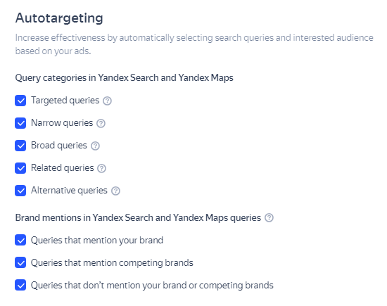 自动定向是在搜索结果中、Yandex Maps 中或在搜索结果和广告网络中投放广告的强制条件。 您必须为每个广告组至少选择一个查询类别。 当您将展示位置从 Yandex 网盟切换到 Yandex 搜索或 Yandex Maps 时,会自动为每个广告组中的所有查询类别启用自动定向。 我们建议您在更改展示位置时仔细检查设置。 您只能对广告网络中投放的广告系列禁用自动定向。