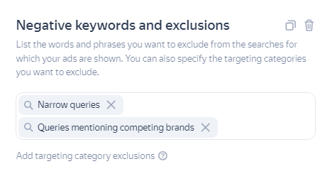 您可以在单独的广告系列中对品牌搜索查询使用自动定向,也可以将提及您品牌和竞争对手品牌的类别组合起来。 品牌查询是与公司品牌直接相关的搜索词。 这些查询包括以下情况的搜索:公司在自然搜索结果中排名第一,或公司是被搜索产品的制造商。 例如,如果您为帮助配置 Yandex Direct 的“良好广告”服务启动广告,则_良好广告_查询是您的广告系列的品牌查询,而 Yandex Direct 查询则不是。
