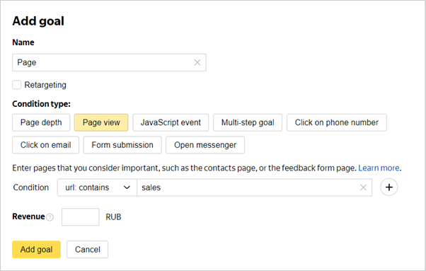 组合 Yandex Audience 用户细分和 Yandex Metrica 目标的示例