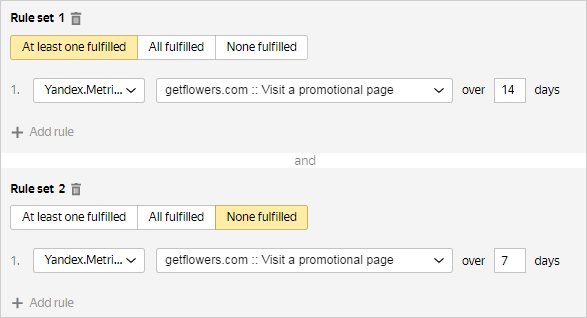根据 Yandex Audience 用户细分、Yandex Metrica 目标或 Yandex Metrica 用户细分创建规则(您可以使用任何包含 100 名或更多用户的自动或自定义用户细分)。