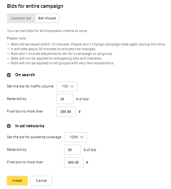 您可以根据所需的流量规模设置搜索出价,按指定百分比提高出价,或者设置最高出价值。 根据设置计算选定的所有关键词的出价。 计算使用流量的当前出价值。
