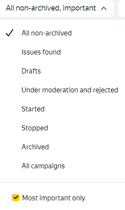 要查看重要广告系列列表,请打开按广告系列状态筛选的筛选器,然后选择 Most important only。