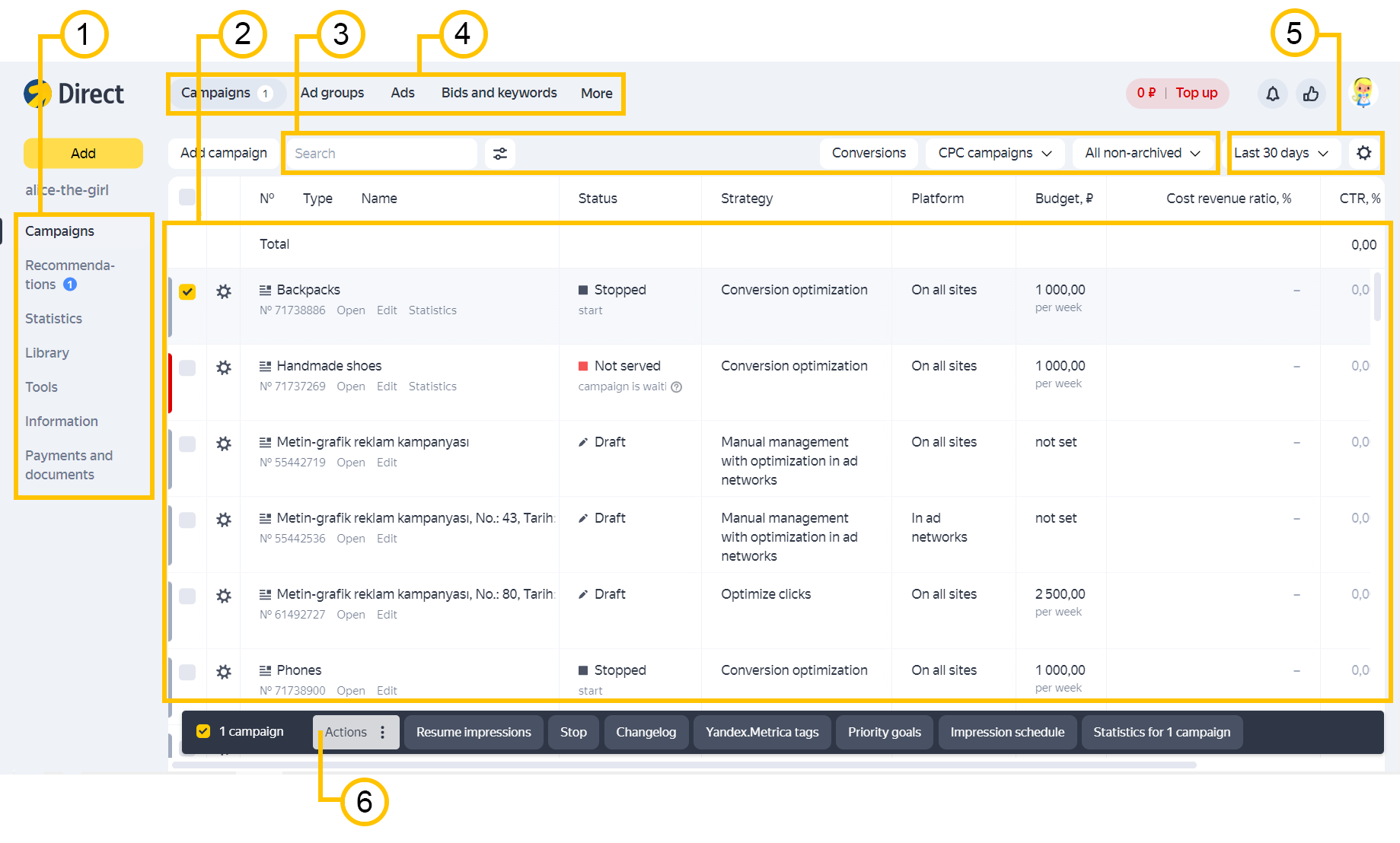 您可以在以下对象之间进行切换:广告系列、广告组、广告和关键词。 首先标记所需的广告系列,然后转到相应的标签页,如 Groups。 其中仅包含所选广告系列中的广告组。