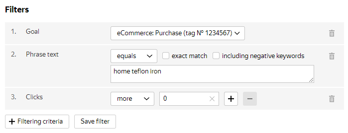 您将看到用户输入的与您的关键词匹配的真正搜索查询。 按 Clicks 列值对报表行进行排序。 这样,您可以识别不会带来转化量的不相关查询。 要排除针对此类查询的广告展示,请将此查询添加到广告系列或广告组的否定短语中(您可以直接在报表页面上进行此操作),或将否定关键词添加到关键词中。