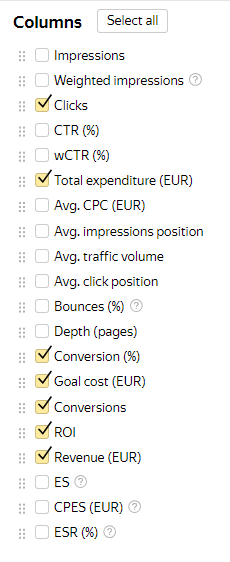 如果您确定每次转化的大概值,但是没有将转化传递给 Yandex Direct,则您可以使用报表中的转化量和成本的有关数据来单独预估收入、利润和投资回报率。
