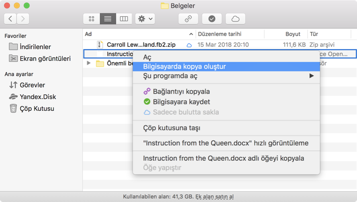 Dosya veye klasörün içerik menüsünde Bilgisayarda kopya oluştur öğesini seçin.