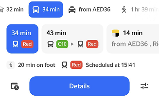 The numbers in the colored squares indicate the numbers and types of transport. Tap Details to see route details.