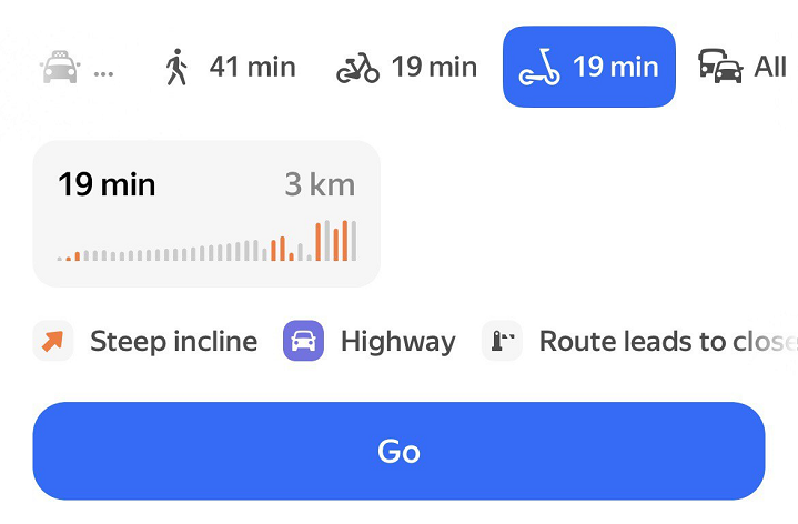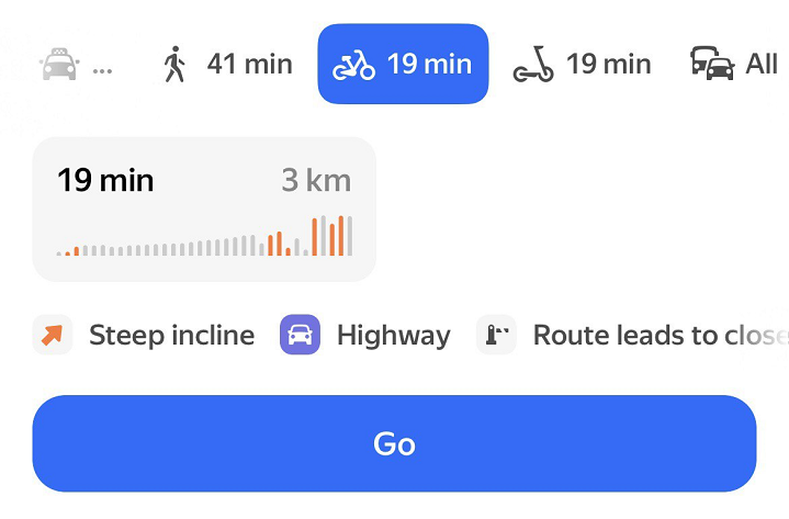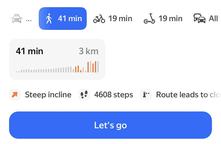 Yandex Maps plots routes for different types of transport. To view and compare all the available options, plot a route and tap .