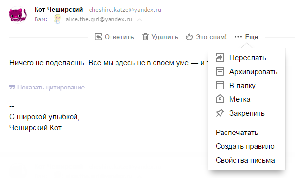 Yandex Mail'de e-postaların özelliklerine bakmak için e-posta okuma sayfasında