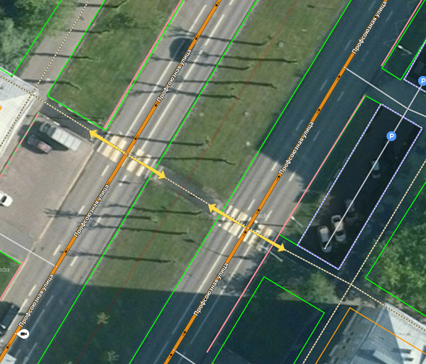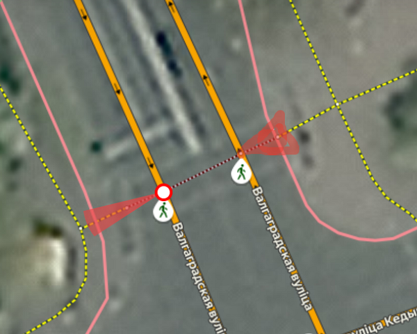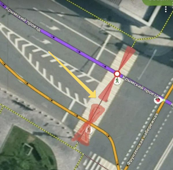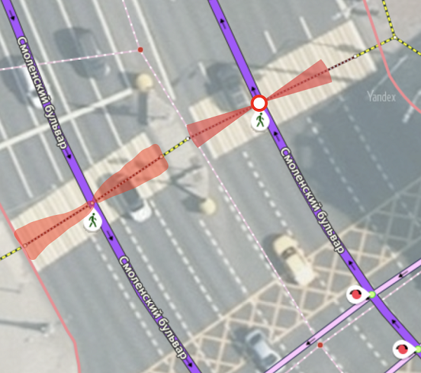 Haritaya alınması gereken trafik ışığı her iki tarafından veya en az bir tarafından yaya kaldırımı olmayan bir yoldan yaya geçidini kontrol ediyorsa, trafik ışığının hem yaya geçidinin hem de otomobil yolunun bölümlerini kontrol ettiği sayılır: