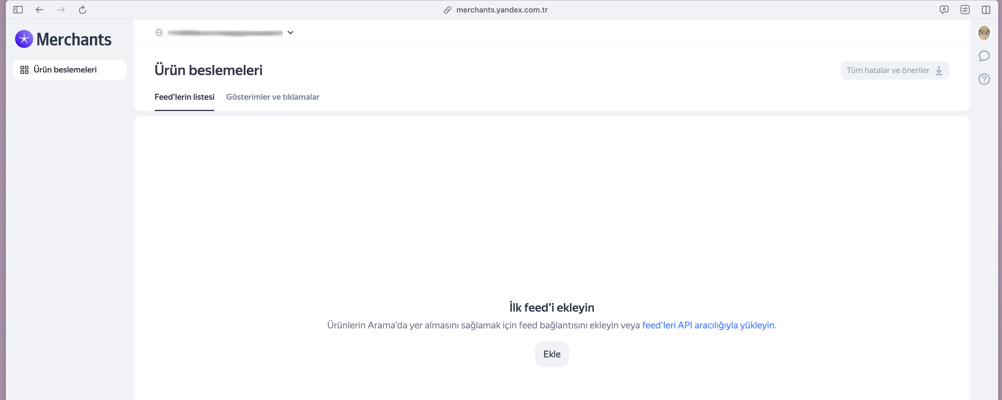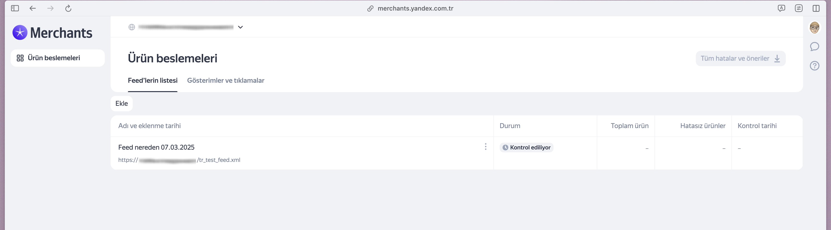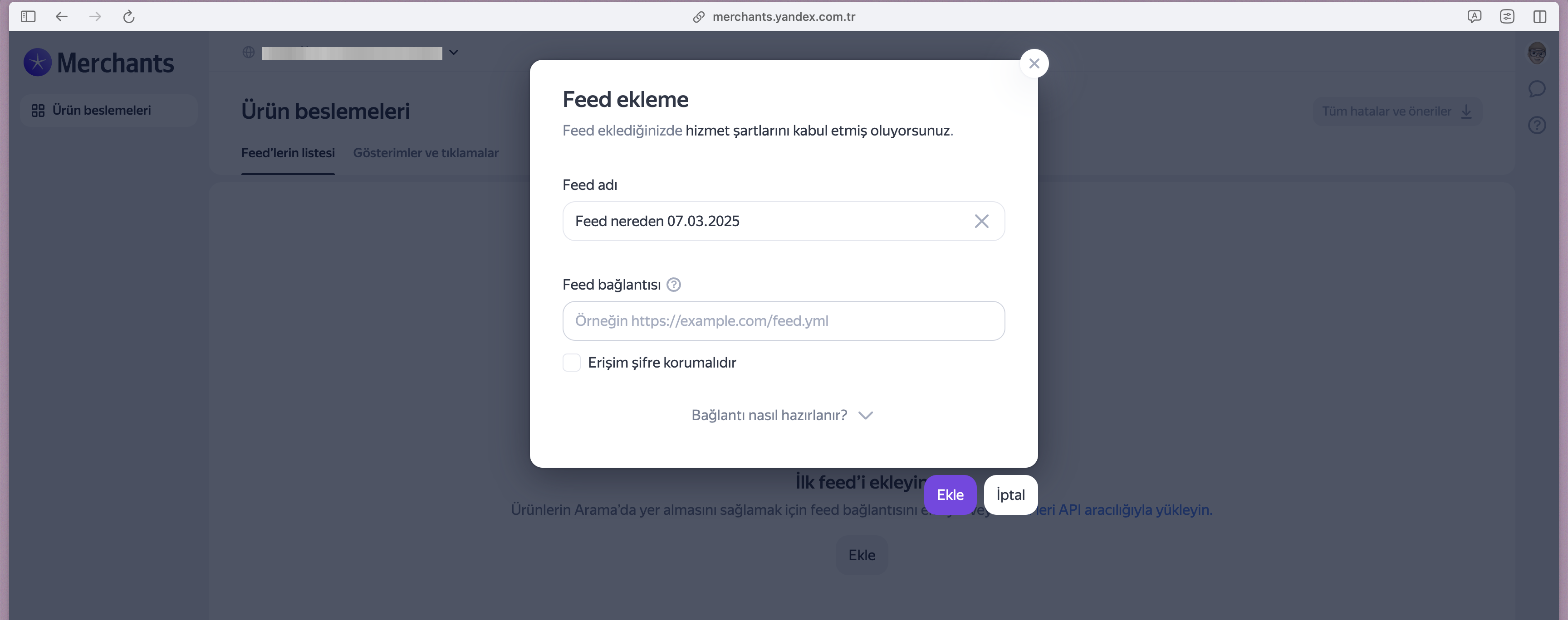 Sonraki aşamada Ekle butonuna tıklayarak ürün çeşitlerinize ait bilgilerin yer aldığı feed'e ait bağlantıyı yüklemeniz gerekmektedir.