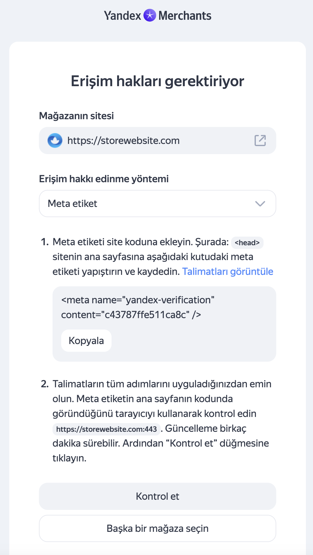 Kod veya dosya eklendikten sonra Yandex, sahipliği doğrulayacak ve onaylayacaktır. Herhangi bir sorunla karşılaşırsanız, geri bildirim formu aracılığıyla destek ekibiyle iletişime geçin — yöneticilerimiz sorunun çözülmesine yardımcı olacaktır.